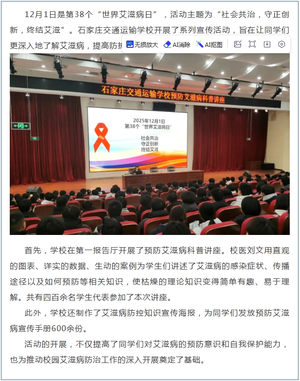 石家庄交通运输学校开展第38个“世界艾滋病日”主题宣传活动