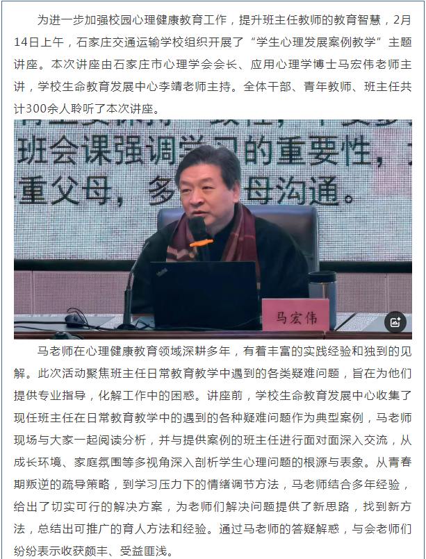 石家庄交通运输学校开展学生心理发展案例教学主题讲座