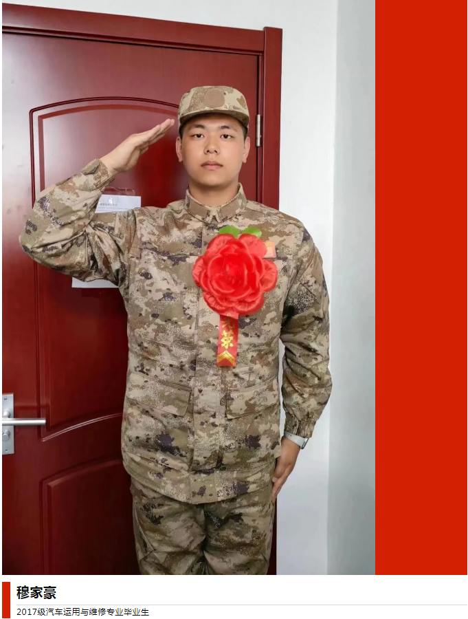 穆家豪,2017年就读于石家庄交通运输学校汽车运用与维修专业。在校期间刻苦学习,勤奋努力,各科成绩优异,先后获得校级三好学生,优秀班干部。2020年通过单招考试进入河北交通职业技术学院。在大学期间,他努力拼搏的劲头毫不懈怠,先后获得优秀团员、国家励志奖学金、院级优秀学生干部、院级二等奖学金、优秀团干部等多项荣誉,2023年又光荣的加入了中国人民解放军。善于磨练自我,是他潜在的韧劲,敢于挑战自我,是他内在的勇气,善于超越自我,是他宝贵的品质。他正以崭新的面貌,积极的心态沿着“八一”军旗指向的道路砥砺前行!