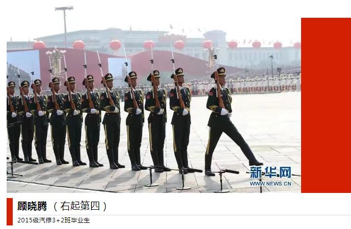 顾晓腾,15汽修3+2班学生。2018年在大学申请入伍,服役至今。在役期间,多次参加国内多项重大任务。2019年国庆作为标兵参加了阅兵活动,并荣获三等功。同年11月参加了武汉的世界军人运动会。之后陆续参加了世园会,建党百年等多项任务。他正用自己心有大我、至诚报国的忠诚,诠释着最美的青春底色。