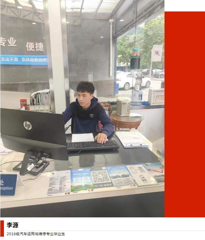 李源,2016级汽车运用与维修专业学生。在校期间学习认真,成绩优异。2018年10月到河北传兴标致实习。实习期间,他虚心向师傅学习,从基本的保养做起,踏实肯干,认真钻研,不放过任何一个疑问、仔细揣摩每个操作细节,还毫无保留地将自己的心得和体会传授给新人,因工作认真严谨被调到保修岗位,在新的岗位,他又踏踏实实地从头干起,很快又成为一名优秀的维修工。出色的表现和热心的工作,受到领导的认可和大家的好评,现在河北传兴东风标致4S店担任保修经理。