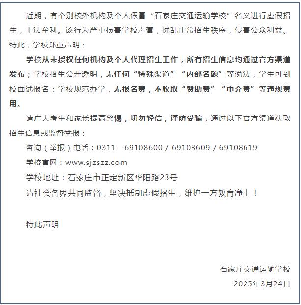 石家庄交通运输学校关于防范虚假招生的郑重声明