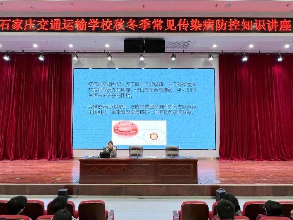 秋冬季节是各种传染病的高发季节,为了防止传染病在校园内传播,提高同学们预防传染病的意识,近日,石家庄交通运输学校开展了“秋冬季节传染病预防”专题讲座活动。本次讲座由学校医务室段少会医生主讲,500余名学生聆听了讲座。