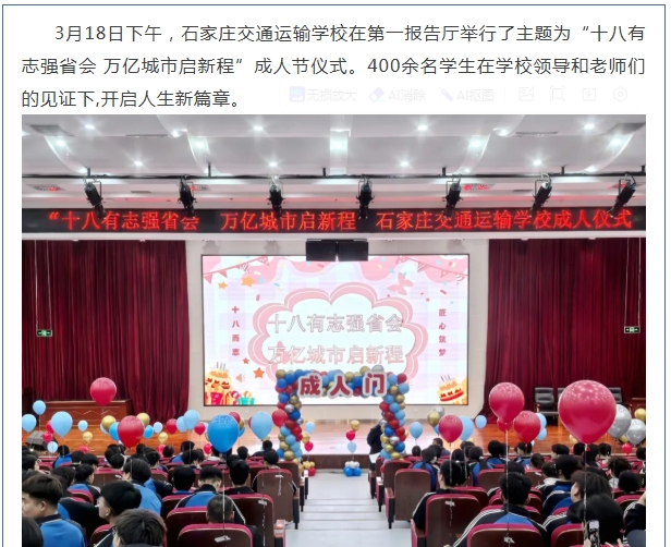 十八有志强省会 万亿城市启新程——石家庄交通运输学校举行2026年成人节仪式