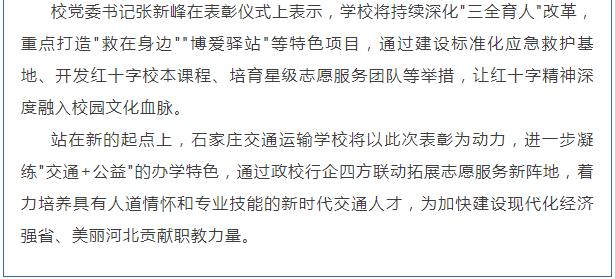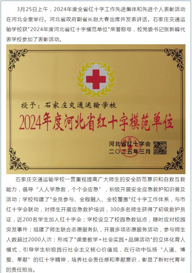 石家庄交通运输学校荣获"2024年度河北省红十字模范单位"称号