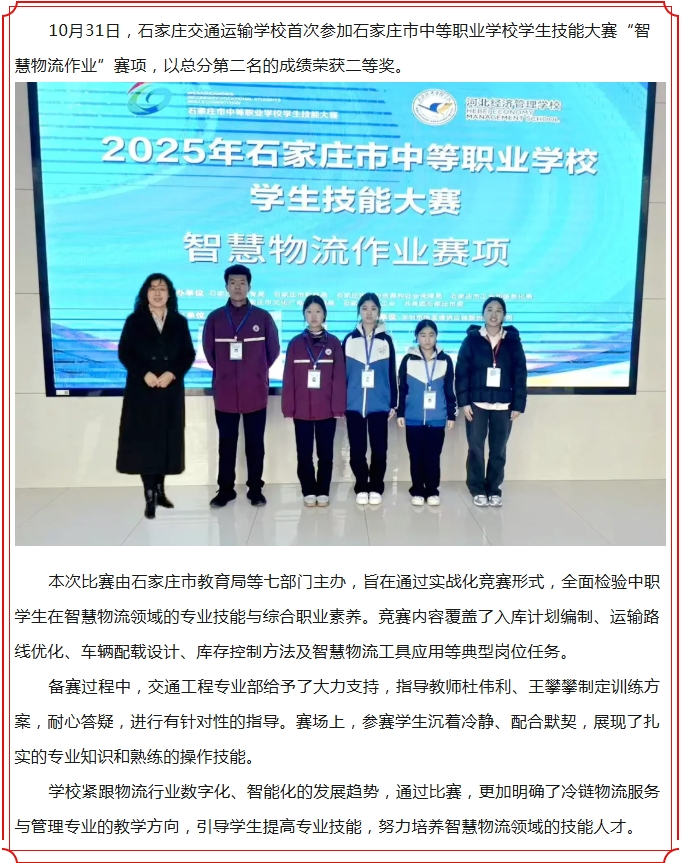 【喜报】石家庄交通运输学校在2025年市中等职业学校学生技能大赛智慧物流作业赛项中喜获佳绩