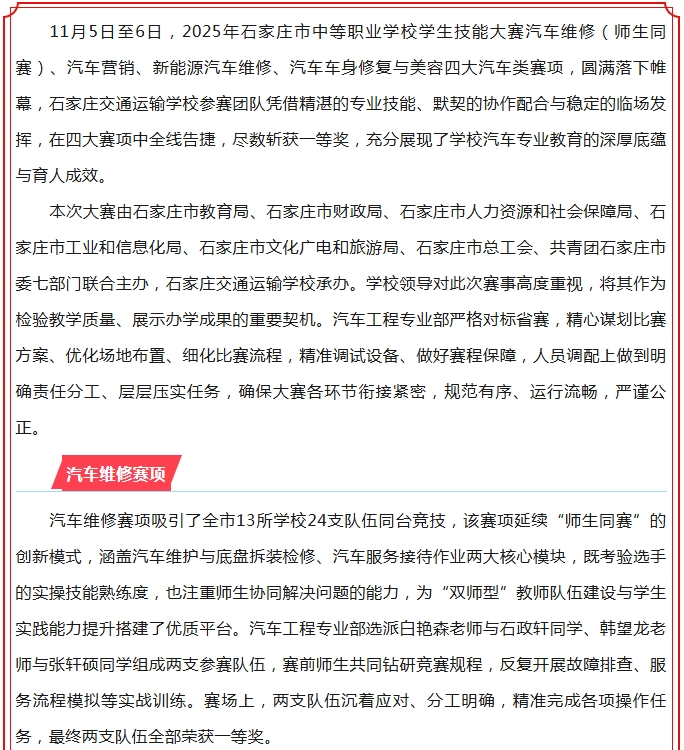 【喜报】市中职学生技能大赛传捷报:石家庄交通运输学校汽车类四赛项尽数摘金