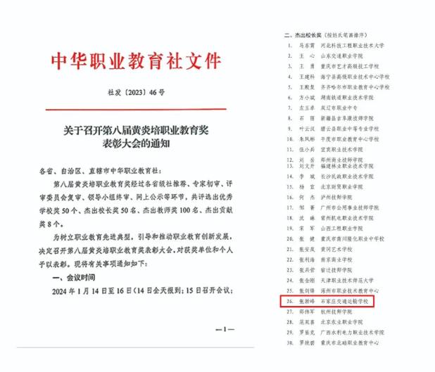 1月15日,第八届黄炎培职业教育奖表彰大会在京举行。石家庄交通运输学校党委书记张新峰荣获“黄炎培职业教育杰出校长奖”。此次获选是交通运输学校又一国家级荣誉,也是学校高质量发展的又一标志性成果。